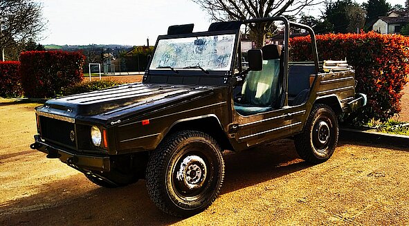 My favourite, from far :) A completely rebuilt/overhauled Bombardier Iltis repowered with a 1.9 TD AAZ VW Engine (the combi T4 one). Gently named "pinocchio" as it came home with a smashed nose.